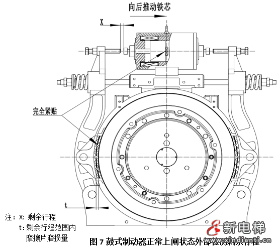 1.2鼓式制動(dòng)器的剩余行程是指制動(dòng)器上閘后(制動(dòng)襯墊緊貼制動(dòng)輪),銜鐵(動(dòng)芯)仍能活動(dòng)的距離。如圖3中X即是剩余行程。