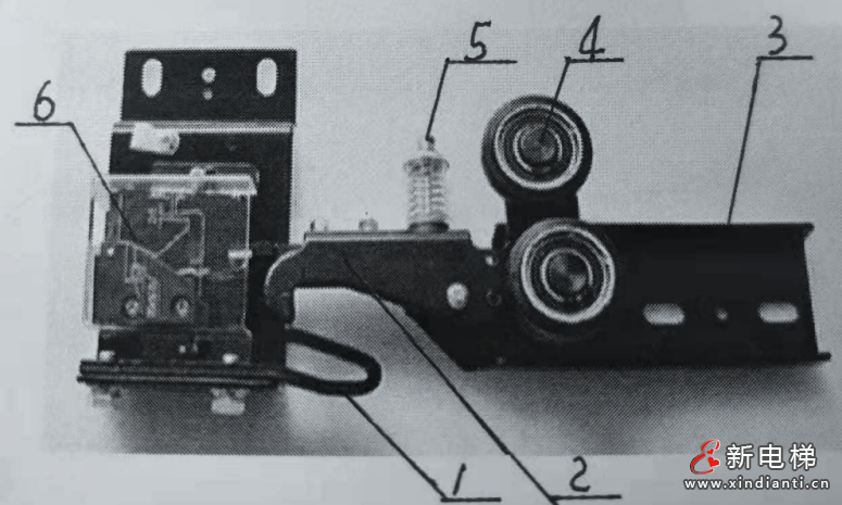 下面依據(jù)圖1,我們來(lái)分析一下圖中自動(dòng)門(mén)鎖的基本結(jié)構(gòu)及動(dòng)作原理;并將上述各類(lèi)問(wèn)題應(yīng)采取哪些方案或措施解決為妥。圖1為某生產(chǎn)廠家制造的161自動(dòng)門(mén)鎖總體結(jié)構(gòu)示意圖。它由底座3、鎖鉤2、鉤座1、壓簧組件5、滾輪4及電氣開(kāi)關(guān)盒6(主要由一對(duì)動(dòng)、靜觸點(diǎn)配對(duì)而成)等標(biāo)準(zhǔn)件組成。該自動(dòng)門(mén)鎖電氣開(kāi)關(guān)盒6與底座3組件分別安裝在層門(mén)上坎組件與門(mén)滑板上(見(jiàn)圖2所示)。而且,它具有制造、安裝及維修技術(shù)要求或技術(shù)指標(biāo)規(guī)定,此處不一一贅述。