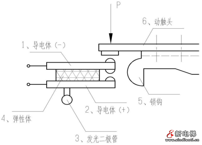 方案一:首先,為解決自動(dòng)門(mén)鎖本身存在地不足及動(dòng)作時(shí)所處樓層問(wèn)題。則在圖1中電氣開(kāi)關(guān)盒6與鎖鉤2之間,加入一電氣信號(hào)傳送用壓力位移傳感器組件,詳見(jiàn)圖3所示。其動(dòng)作原理為:當(dāng)門(mén)鎖在關(guān)門(mén)閉合時(shí),鎖鉤5連同動(dòng)觸頭6壓在導(dǎo)電體1上。此時(shí),動(dòng)觸頭6用一定預(yù)壓力P值壓縮絕緣彈性體4,使導(dǎo)電體1的觸頭與導(dǎo)電體2觸頭結(jié)合而導(dǎo)通門(mén)鎖回路。同時(shí),發(fā)光二極管點(diǎn)亮,則驗(yàn)證門(mén)鎖已閉合且動(dòng)作可靠地完成。否則,門(mén)鎖已壞或接觸不好(無(wú)預(yù)定壓力)。