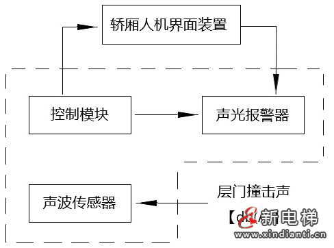 進(jìn)一步地來(lái)說(shuō),在圖5外呼盒上增設(shè)一聲光報(bào)警器,其動(dòng)作原理詳見(jiàn)圖6所示。正如案例4所指的問(wèn)題,當(dāng)有人有意或無(wú)意撞擊層門(mén)時(shí),撞擊門(mén)板聲音超過(guò)一定閾值【或≥70dB(A)】時(shí),通過(guò)聲波傳感器與控制模塊,推動(dòng)聲光報(bào)警器動(dòng)作,發(fā)出警示光線(xiàn)及聲響,持續(xù)一定時(shí)間;并可選擇語(yǔ)音定制。更進(jìn)一步的在轎廂人機(jī)界面操作裝置9上顯示故障。由此,此方案在電梯安裝調(diào)試時(shí),通過(guò)電機(jī)自學(xué)習(xí),使每一樓層的固定樓層信號(hào)或與平層感應(yīng)器通過(guò)的電氣信號(hào)作為唯一識(shí)別碼,將此信息通過(guò)電控操作系統(tǒng)轉(zhuǎn)換成數(shù)字信息存入虛擬主機(jī)7。或可存入通常的微機(jī)板處理器中。