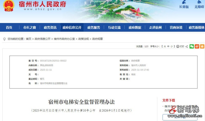 《宿州市電梯安全監(jiān)督管理辦法》將于2026年1月1日起正式施行。該辦法由安徽省宿州市人民政府于2025年11月11日公布。
